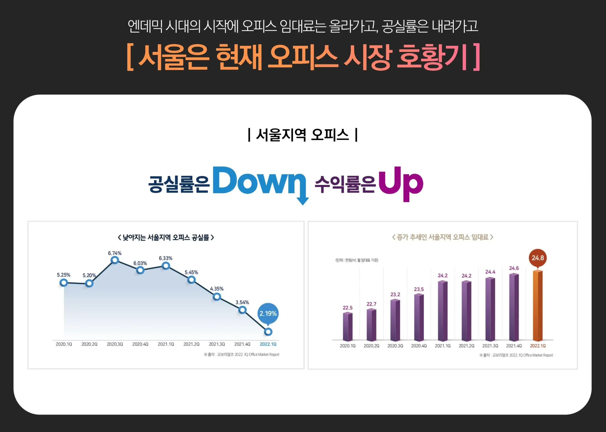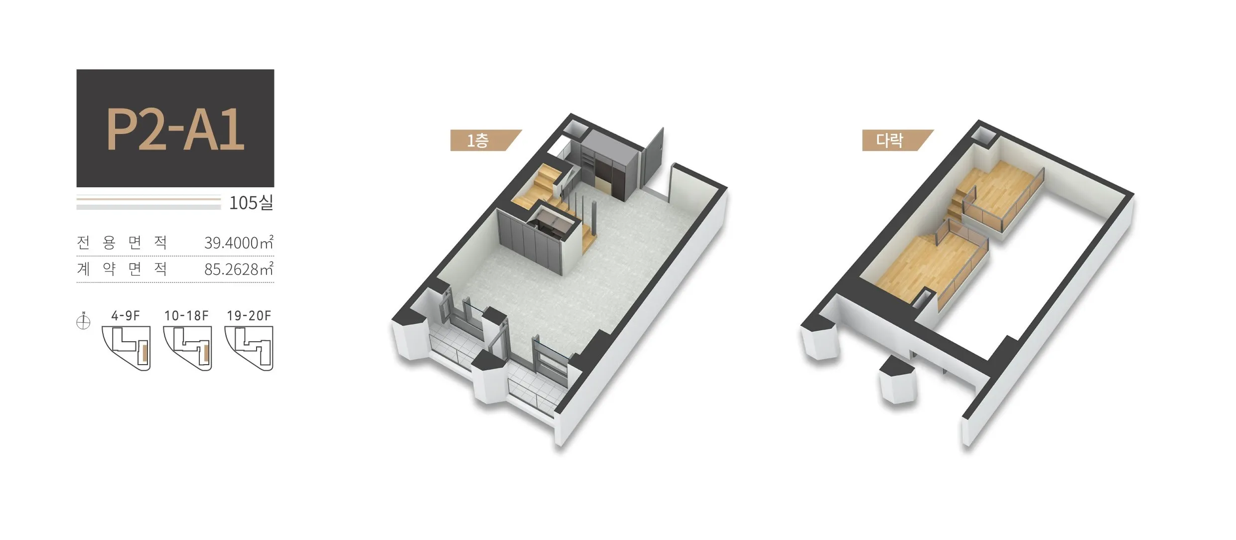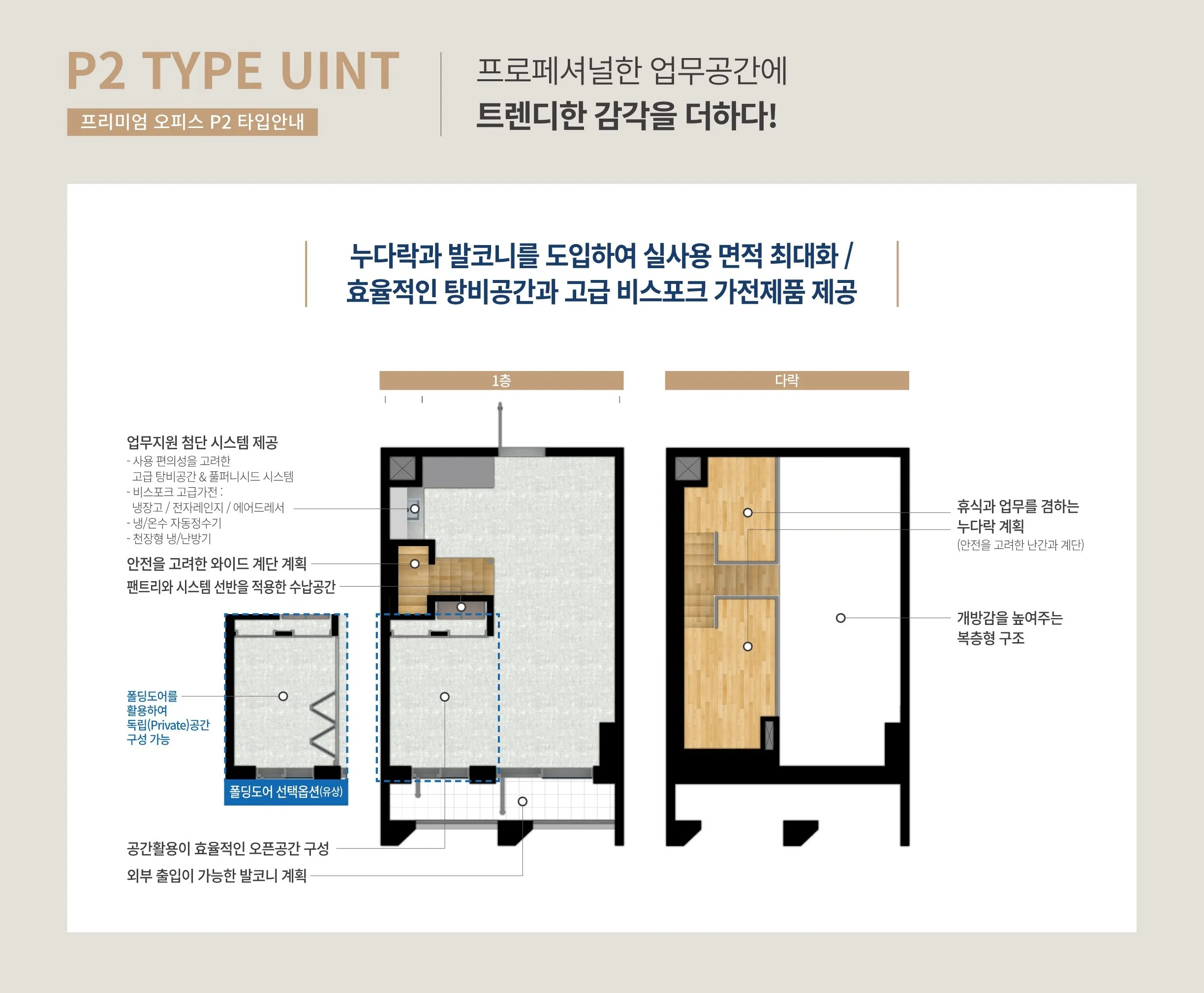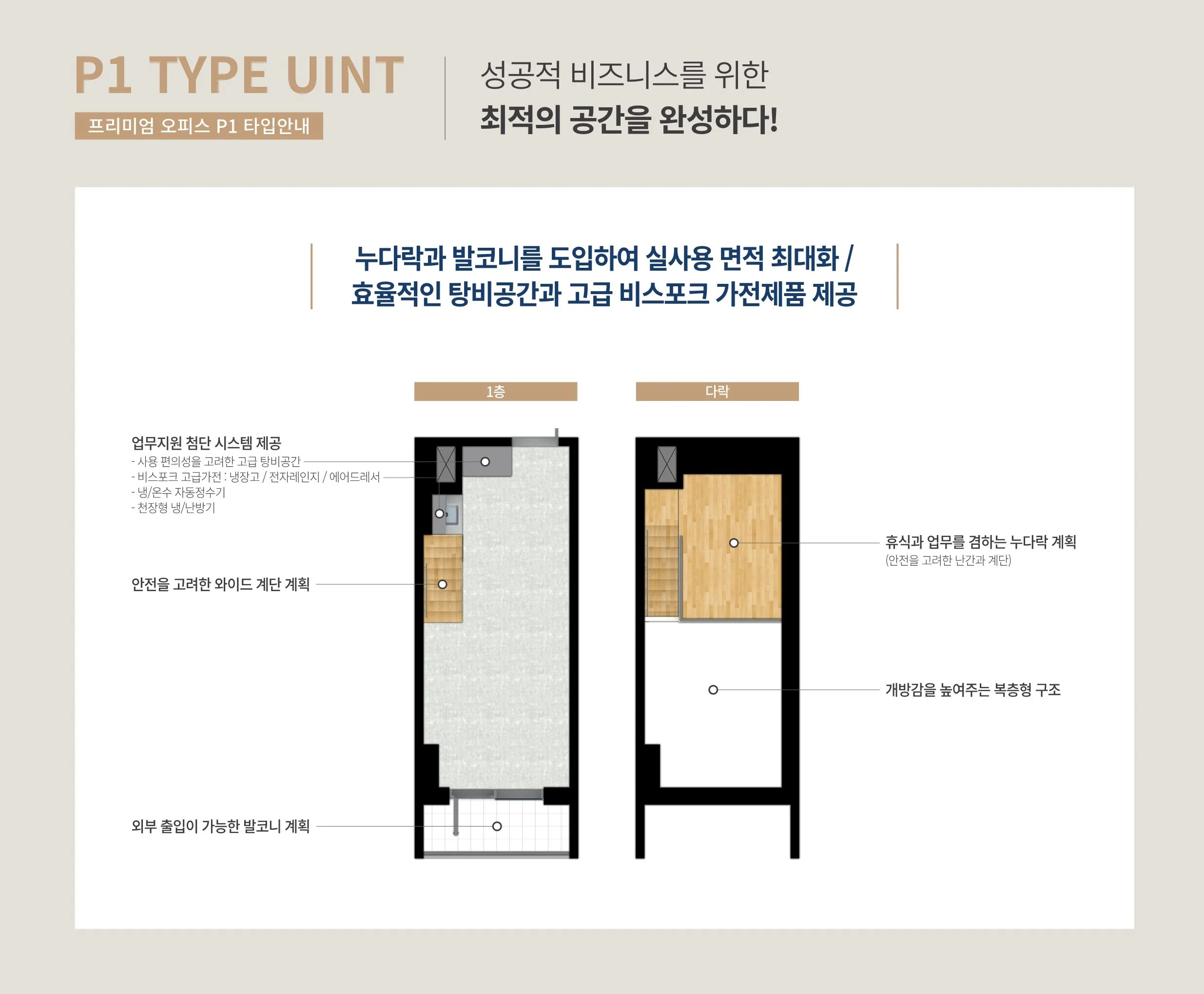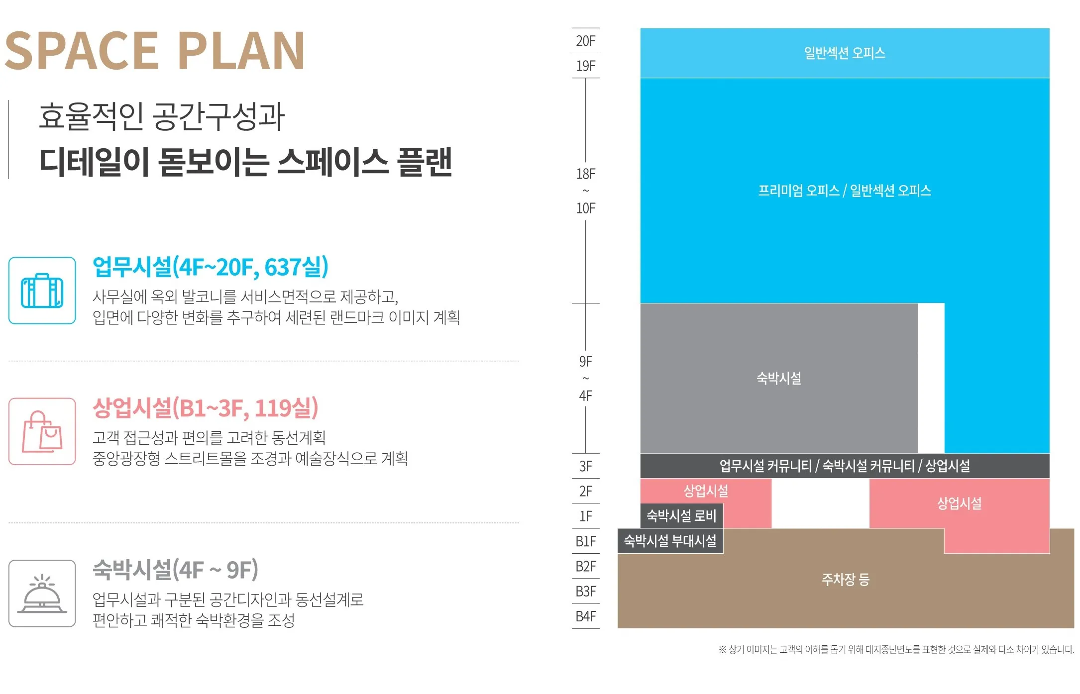 업무시설은 최대 4.2m의 높은 층고와 모든 호실에 발코니와 천정형냉난방기가 적용됩니다. 프리미엄 오피스에는 누다락과 풀옵션 이 적용되며, 일반 섹션오피스는 확장이 가능해 대형 사업체에 적합 합니다.