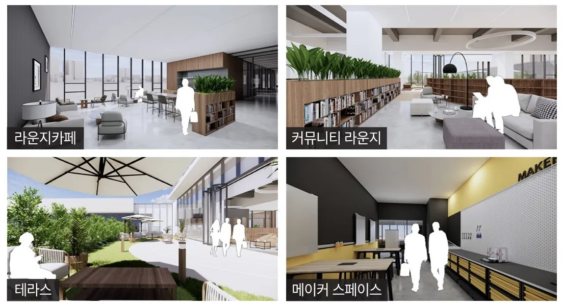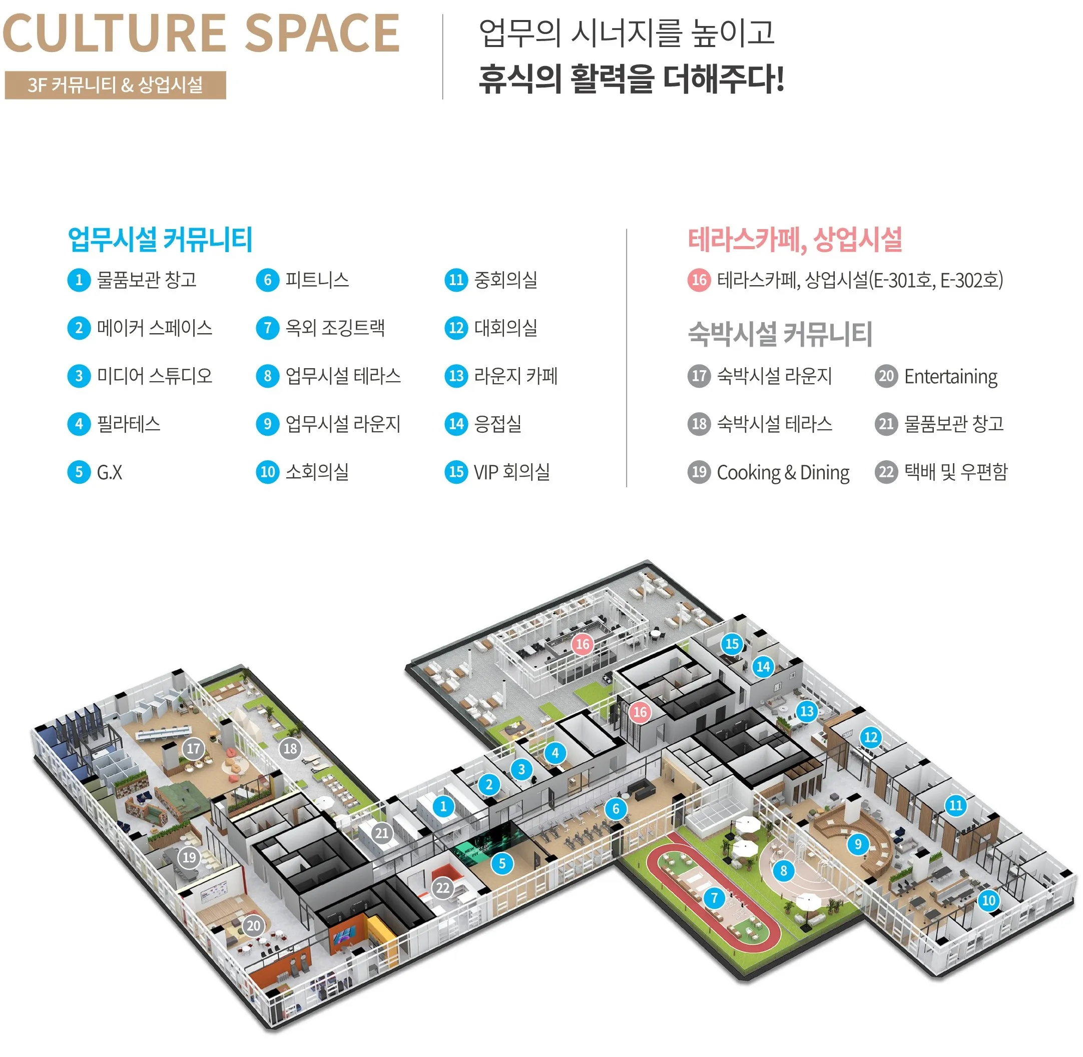 플라이크 은평 3층에는 오피스입주자들을 위한 공용커뮤니티시설이 준비되어 있습니다. 거뮤니티 구성은 라운지, 고급 회의실, 피트니스, 옥외조깅트랙, 미디어 스튜디오 등도 갖춰 입주기업이 편리하게 이용할 수 있도록 했습니다.
